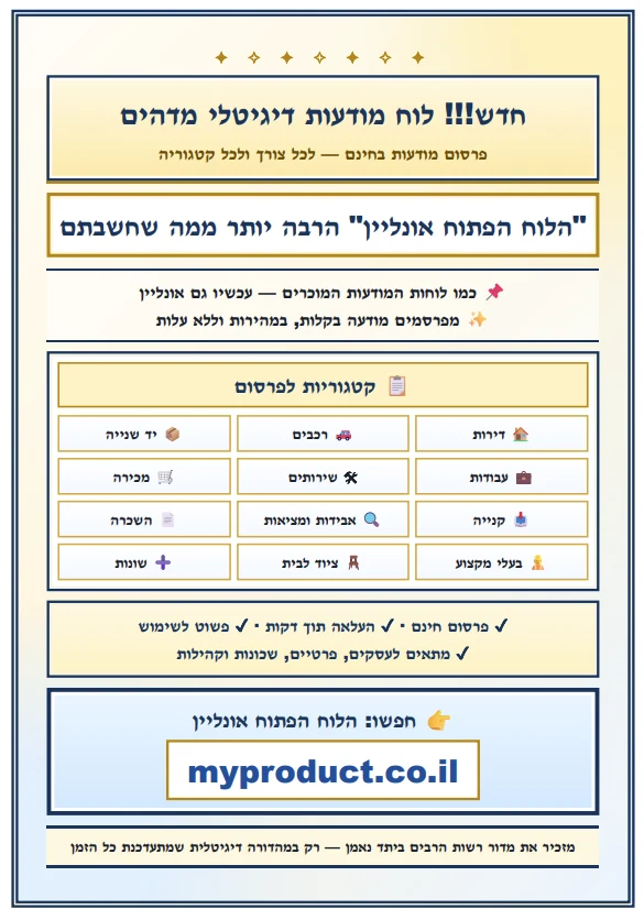 הלוח הפתוח אונליין מאפשר לגולשים למצוא מודעות לפי עיר, קטגוריה ותחום עניין — בצורה פשוטה, נוחה ומהירה.